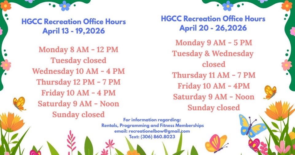 Rec hours Apr 13-19, 20-26, click for details