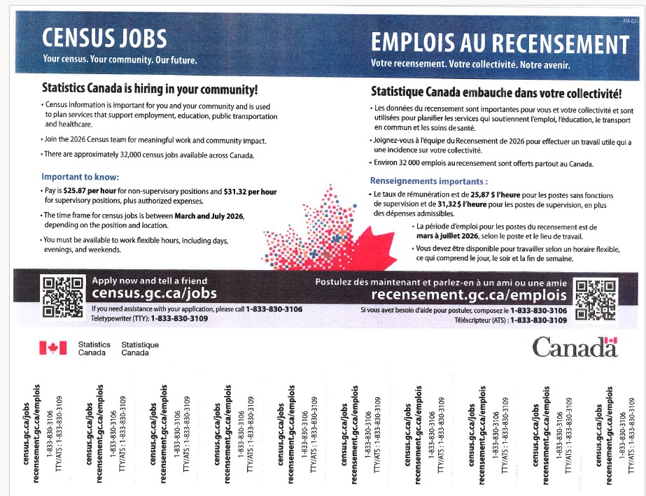 Statistics Canada is hiring for the 2026 census - supervisory & non-supervisory positions - apply online ASAP as training starts soon. Or call the number on the poster