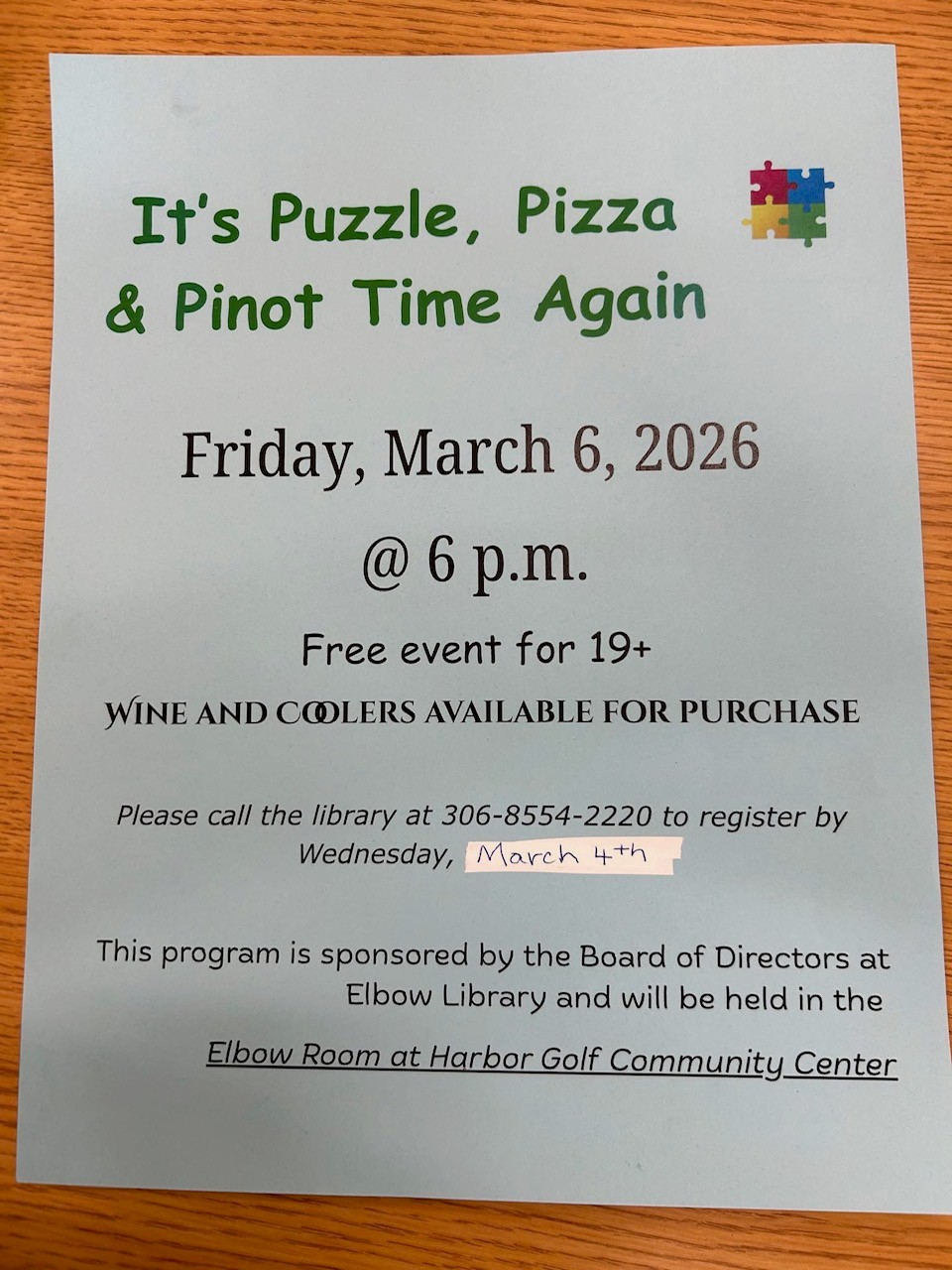 Pizza, Pinot & Puzzles - Elbow Library Event